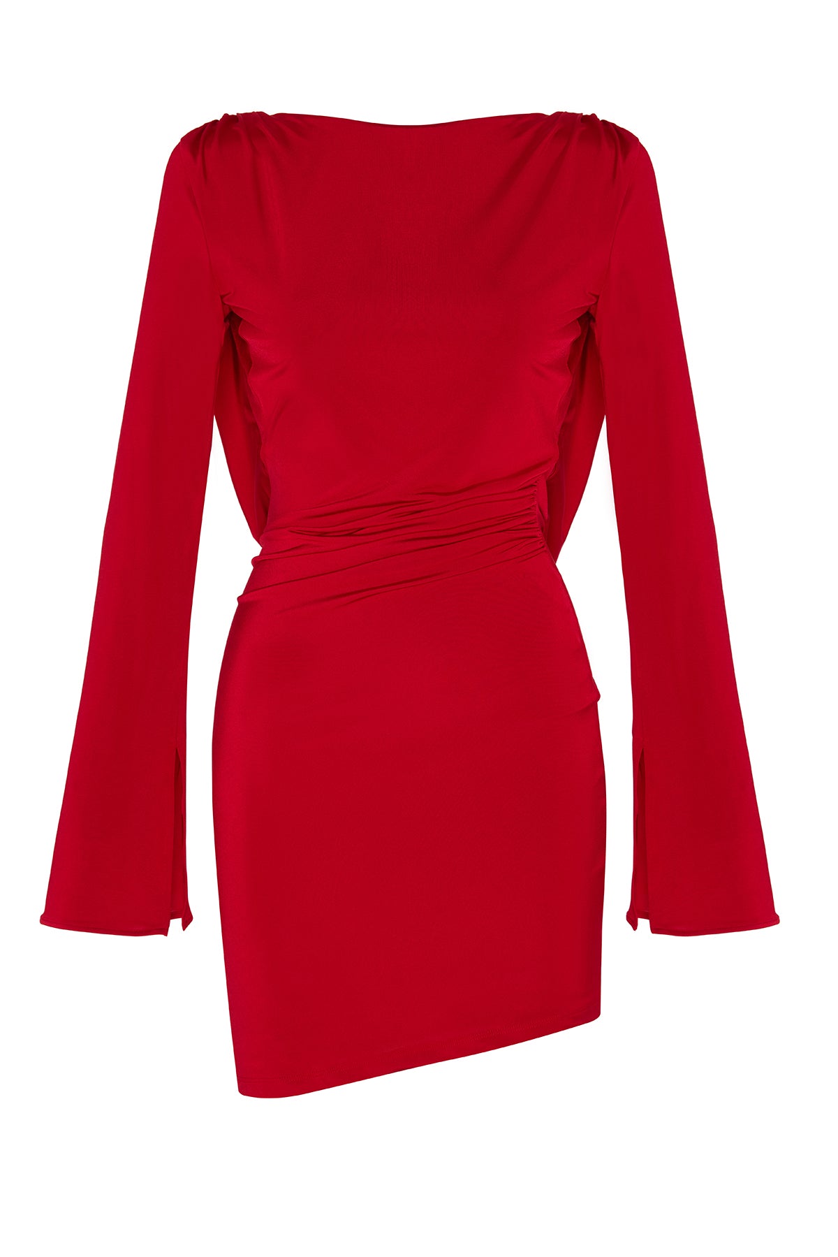 Reflecting sophistication at its finest, this mini dress captivates with its dramatic open-back design. Its fluid and stretchy texture embraces the body with ease, while the long sleeves add a sense of balanced elegance. The mini cut offers modern allure, as the draped back detail creates an unforgettable feminine silhouette. A piece that embodies confidence and elevates your style to iconic heights.