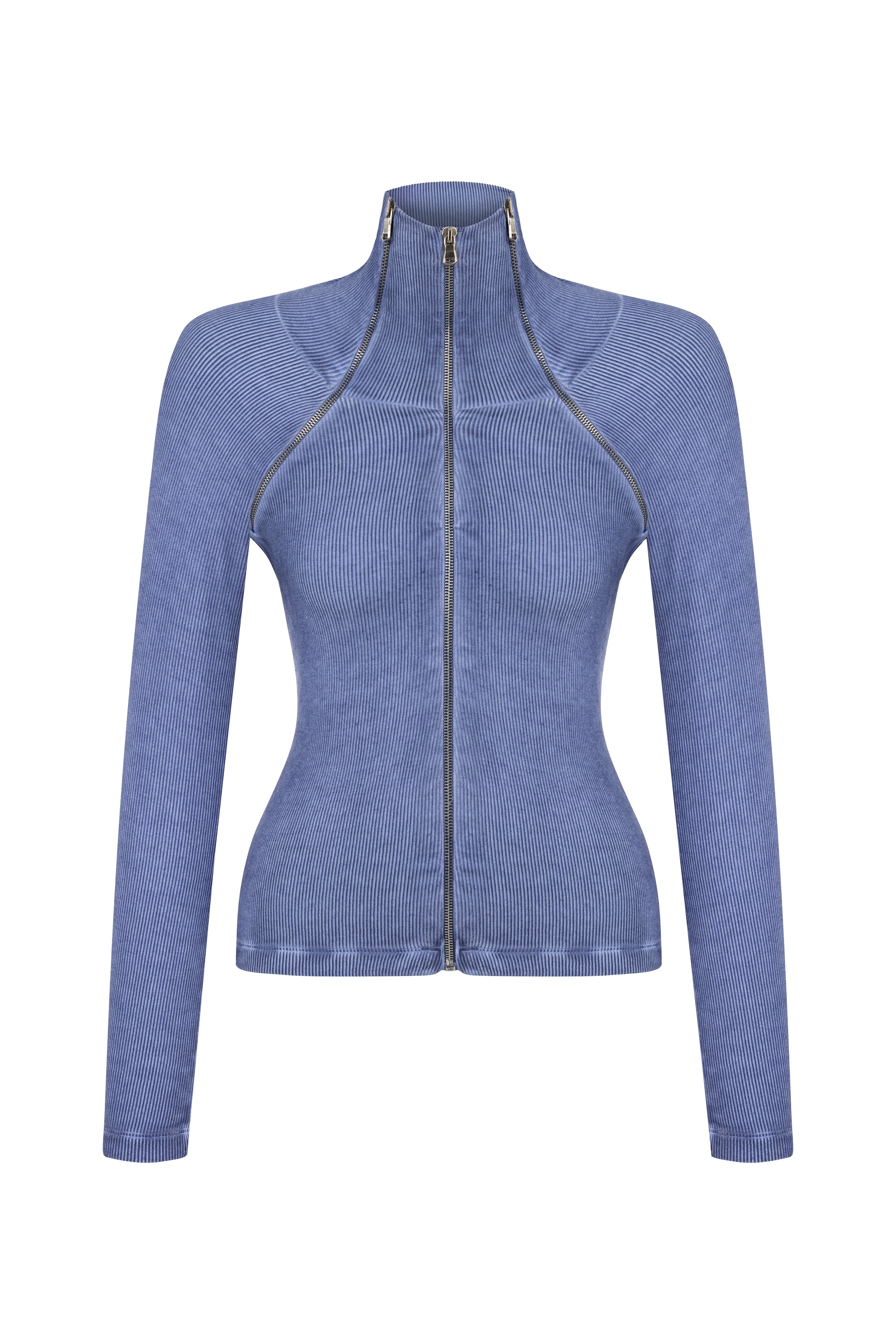 Introducing Transient Top in Blue chic long-sleeved blouse with an asymmetrical turtleneck that's designed to turn heads. The unique neckline adds an edgy twist to your look, while the zipper detail extending from underarm and throughout adds an element of intrigue and versatility.